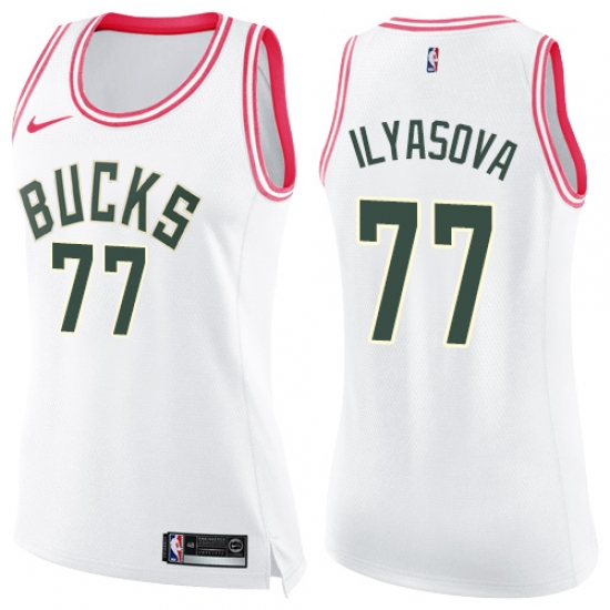 >Women's Nike Milwaukee Bucks #77 Ersan Ilyasova Swingman White Pink Fashion NBA Jersey