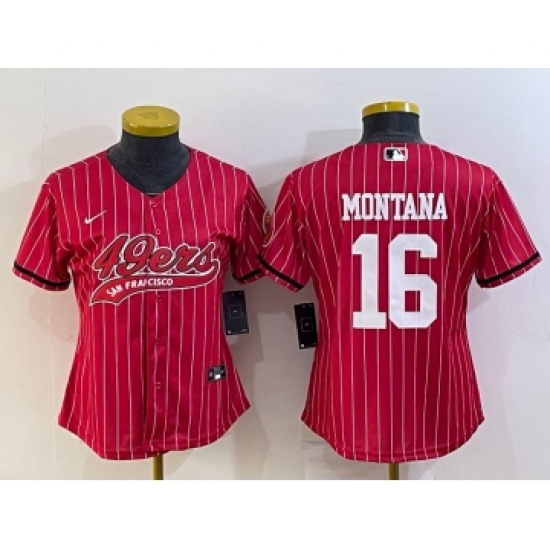 >Women's San Francisco 49ers #16 Joe Montana Red Pinstripe With Patch Cool Base Stitched Baseball Jersey
