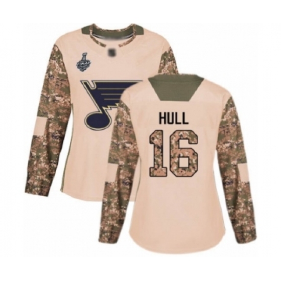 Women's St. Louis Blues #16 Brett Hull Authentic Camo Veterans Day Practice 2019 Stanley Cup Final Bound Hockey Jersey