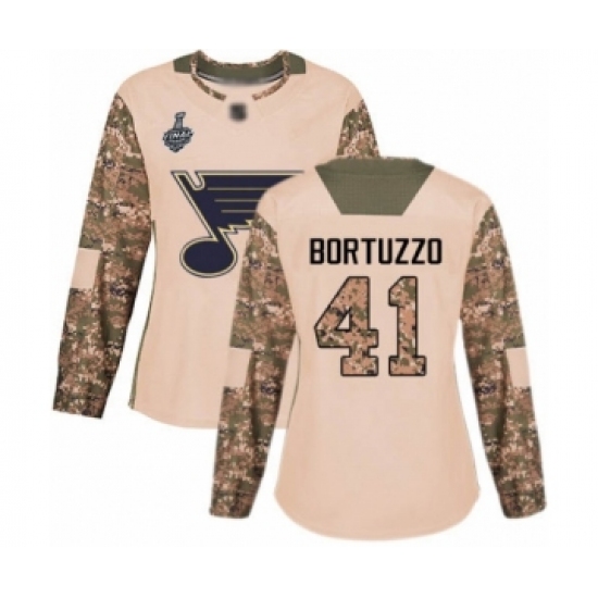 Women's St. Louis Blues #41 Robert Bortuzzo Authentic Camo Veterans Day Practice 2019 Stanley Cup Final Bound Hockey Jersey