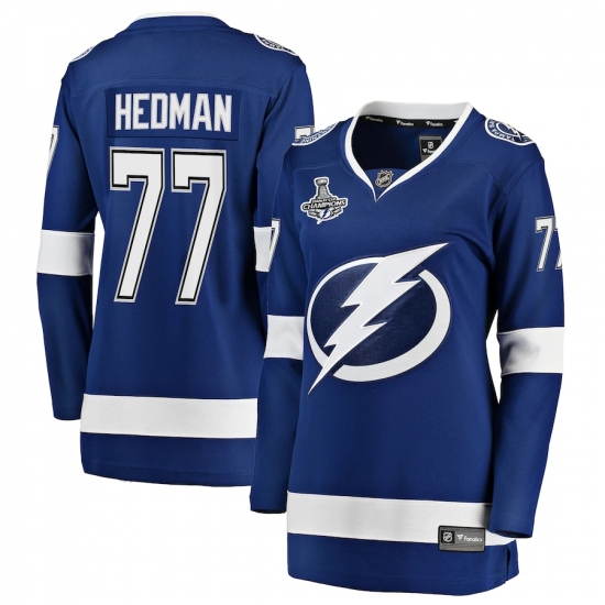 >Women's Tampa Bay Lightning #77 Victor Hedman Fanatics Branded Blue Home 2020 Stanley Cup Champions Breakaway Jersey