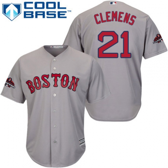 >Youth Majestic Boston Red Sox #21 Roger Clemens Authentic Grey Road Cool Base 2018 World Series Champions MLB Jersey