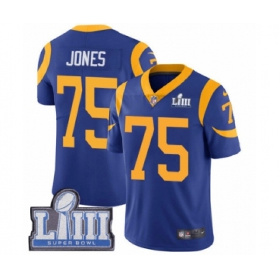 Men's Nike Los Angeles Rams #75 Deacon Jones Royal Blue Alternate Vapor Untouchable Elite Player Super Bowl LIII Bound NFL Jersey