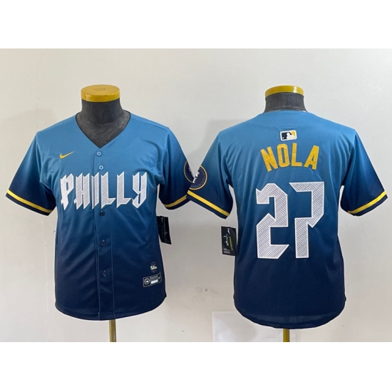 >Youth Philadelphia Phillies #27 Aaron Nola Blue 2024 City Connect Limited Stitched Jersey