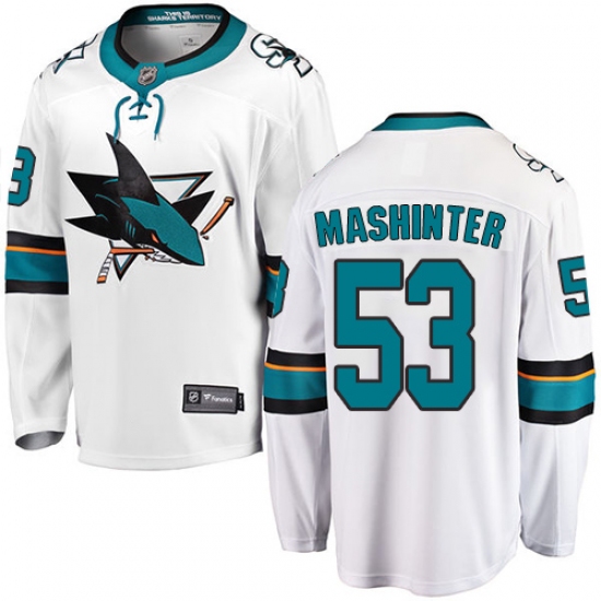 Home>NHL>San Jose Sharks>Brandon Mashinter>Youth San Jose Sharks #53 Brandon Mashinter Fanatics Branded White Away Breakaway NHL Jersey