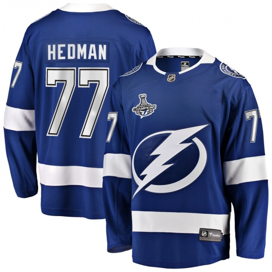 >Youth Tampa Bay Lightning #77 Victor Hedman Fanatics Branded Blue Home 2020 Stanley Cup Champions Breakaway Jersey